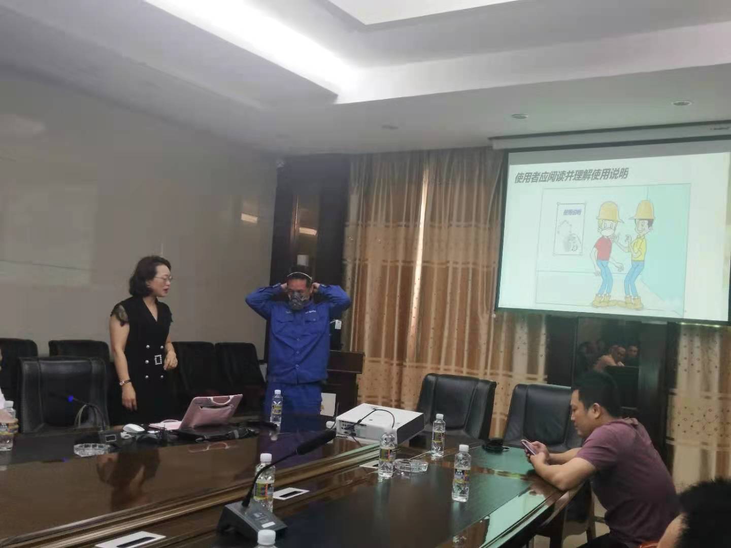 同時,李總作為授課專家在課堂上現場演示了防護用品的正確使用方法以及注意事項,糾正了工人們在日常工作中防護用品使用管理的常見錯誤等,提高企業一線工人的職業健康防護意識,維護勞動者的健康權益。